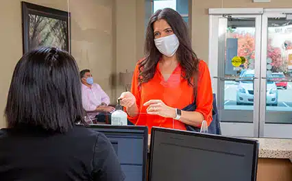 Woman with an orange shirt and face mask talking to a woman with a black shirt at the reception desk while socially distanced.